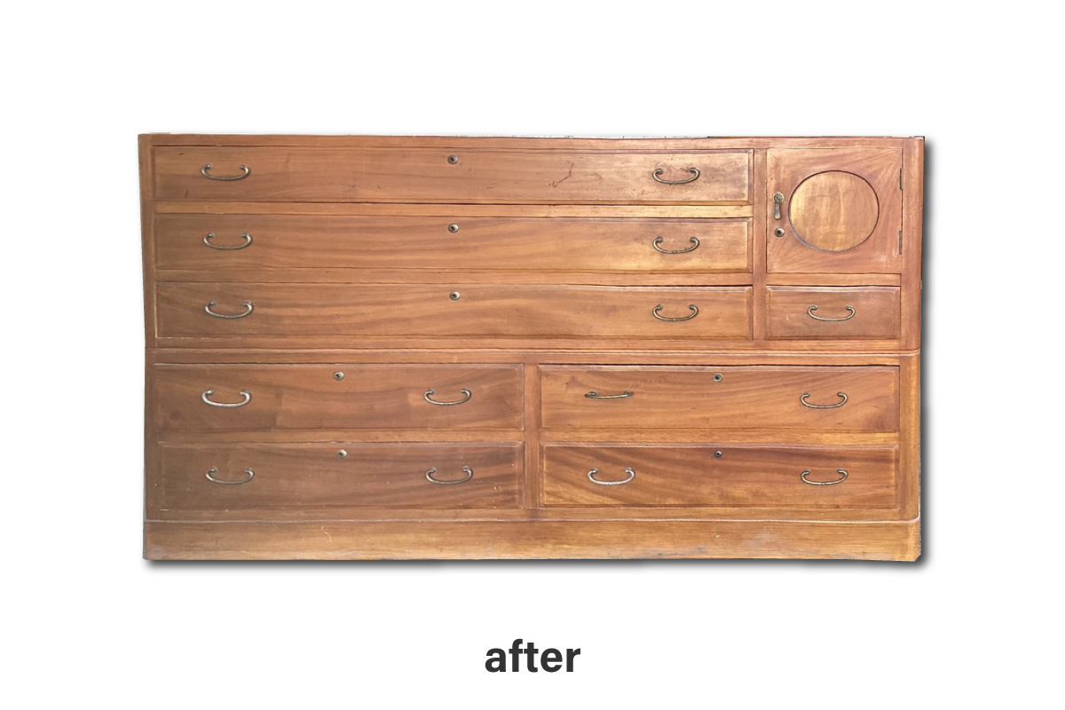 2025年11月1日 再生家具 納品事例(再生家具) 三つ重ね楠タンスの再塗装 三つ重ねの立派な楠タンスをお預かりしました。 長年浴び続けた西日により、側面がツートンカラーのように変色し、引き出しも固く閉ざされた「使えない状態」に。 まずは全体を丁寧に磨き上げ、色むらをリセット。欠損していた金具を補充し、引き出しの調整によって、再びスムーズな開閉を取り戻しました。 仕上げは耐久性の高いウレタン塗装で、楠の美しい木目を保護。 ▸その他家具の修理事例はこちら ▸お問い合わせはこちら 箪笥 0 Comments